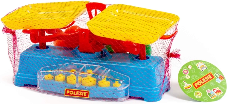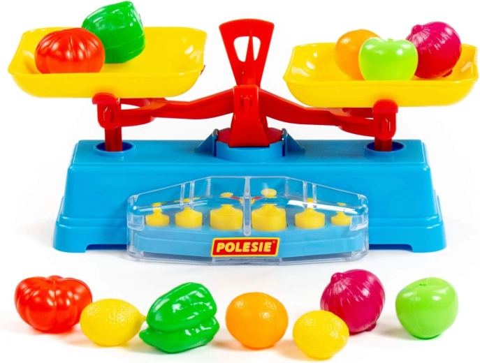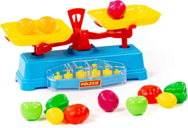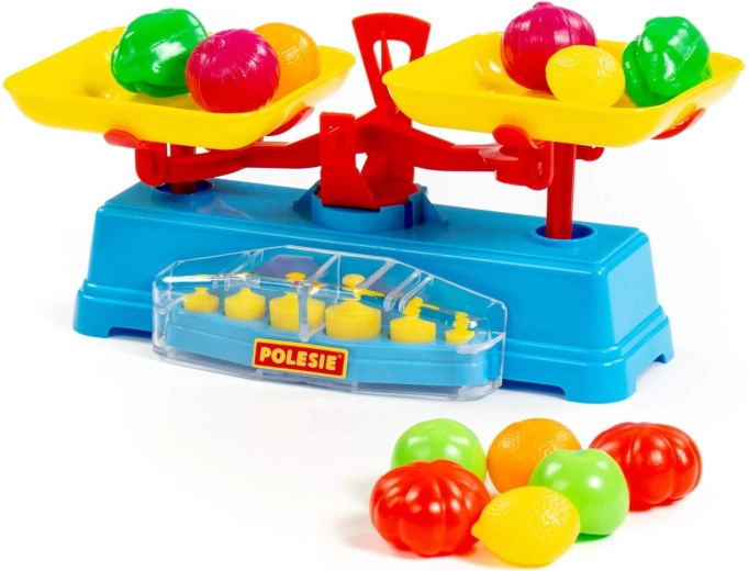 Das Spielset umfasst eine Waage, zwei Schalen und 6 Gewichte.