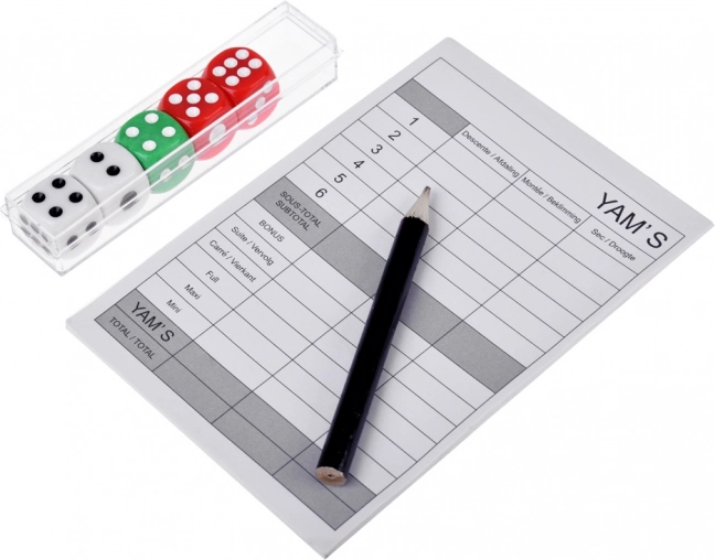 Dieses vielseitige Set bringt alles mit, was Sie für Yams und andere Würfel- und Gesellschaftsspiele benötigen. Dank der gut lesbaren Würfelaugen, dem beiliegenden Ergebnisblock und dem Bleistift können Sie jederzeit und überall spielen. Mit dem stabilen Etui bleibt das Zubehör stets ordentlich beisammen.