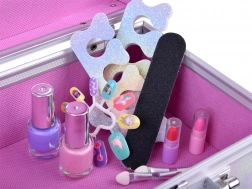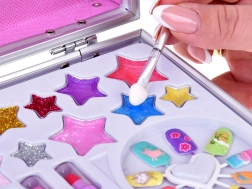 Der Koffer enthält alles, was Sie für ein lustiges Make-up benötigen: Nagellack, Lippenstifte, Lidschatten, Applikatoren, Klebenägel und Aufkleber. Für einfacheres Schminken ist innen auch ein Spiegel.