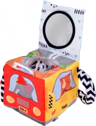 • Farbiger Textilwürfel mit sicherem Spiegel und schwarz-weißen, weichen Griffen