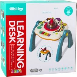 Auf einer Seite des Tisches befindet sich ein interaktives Bildungs-Panel mit bunten Effekten, die Spielen und Entdecken unterstützen. Es bietet Ton- und Lichteffekte sowie bewegliche Elemente wie ein buntes Klavier, ein Trommel und bewegliche Rädchen. Diese Aktivität hilft, die Sinne, Feinmotorik, Hand-Auge-Koordination und logisches Denken zu entwickeln.