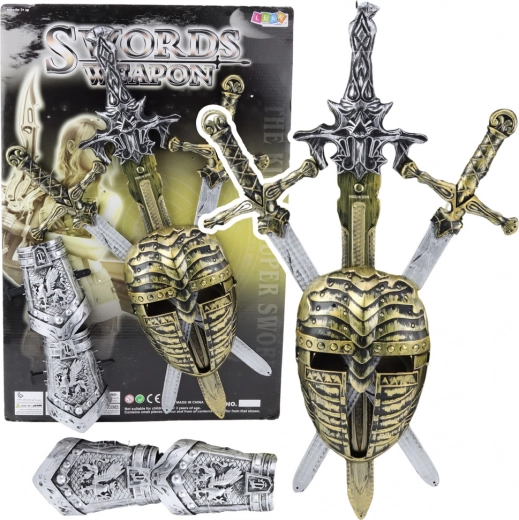 Mit diesem Rittersatz können Kinder zu tapferen Kämpfern werden. Dank der stilisierten Maske erhalten sie ein ritterliches Aussehen und fühlen sich wie im Mittelalter. Das Set beinhaltet drei Schwerter in verschiedenen Größen, eine dekorative Maske und zwei Handschützer, die dem Gesamtlook einen realistischen Ritterstil verleihen.