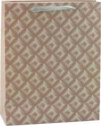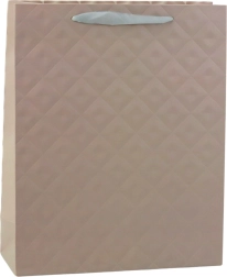 Diese Geschenktasche besteht aus hochwertigem, verstärktem Papier. Die Oberfläche ist mit einem geometrischen Relief verziert, das das Licht wunderschön reflektiert. Sie verfügt über satinierte Griffe in einem sanften Farbton, die ein bequemes Tragen gewährleisten und der Tasche einen feinen Charakter verleihen.
