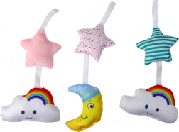 Das Set enthält drei hängende Plüschspielzeuge – Mond, Wolke und Stern – die mit Blick auf Sicherheit und sensorische Stimulation der Kleinsten entworfen wurden. Die weichen Figuren in Pastellfarben helfen, Vision, Berührung und Bewegungskoordination des Kindes zu entwickeln. Das Mobile weckt Neugier und bietet in jeder Situation ein Gefühl der Geborgenheit.