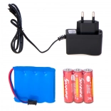 Enthalten sind ein 4,8‑V‑700‑mAh-Akku, ein Netzladegerät sowie Batterien für den Sender (3× AA). Auspacken und losfahren.