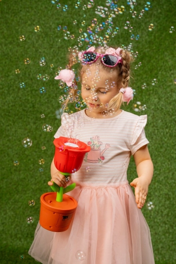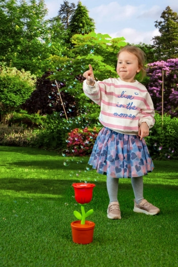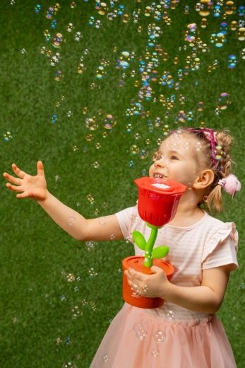 Diese Seifenblasenmaschine in Form einer roten Rose im Blumentopf begeistert alle Kinder, die Bewegung und Spiele an der frischen Luft lieben. Einfach die Flüssigkeit einfüllen, einschalten und zusehen, wie viele glitzernde Blasen um euch herum schweben. Die LED-Beleuchtung verleiht den Blasen einen besonderen Look, vor allem in der Dämmerung und am Abend.