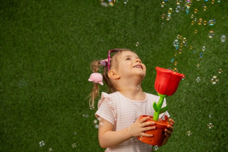 - Niedlicher Blumen-Look: ein Spielzeug, das Kinder zu Bewegung und zum Blasenfangen animiert.