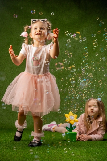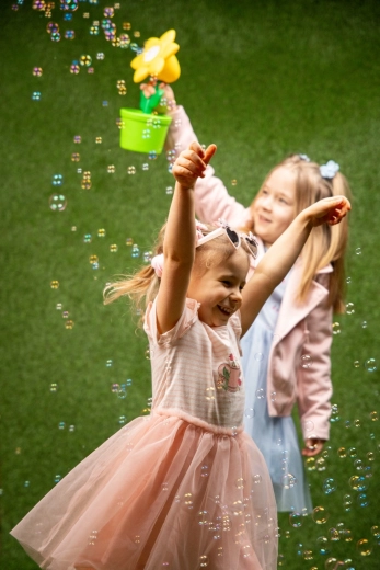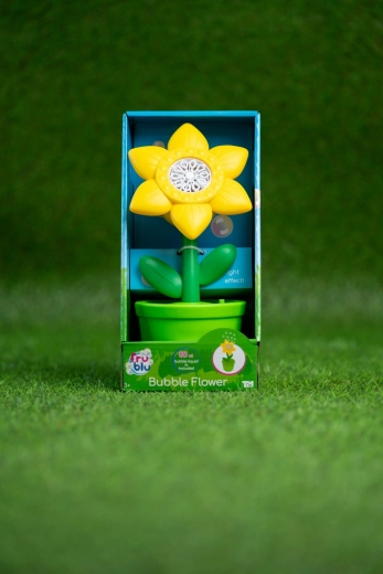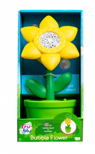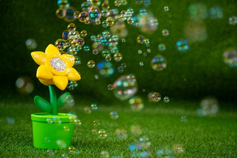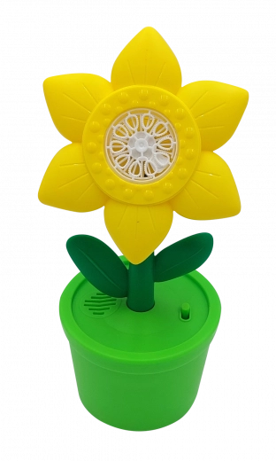 Das Design in Form einer gelben Blume in einem grünen Blumentopf fällt sofort ins Auge und verwandelt jedes Spiel in eine fröhliche Show voller Seifenblasen.