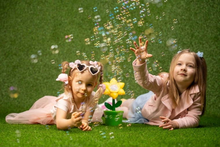 Einfach 3× AA-Batterien einlegen, die Lösung einfüllen und einschalten. Der stabile „Blumentopf“ steht sicher auf Rasen und Tisch – und ihr könnt dem Blasenstrom einfach zusehen.