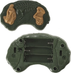 Fossilienförmige Fernbedienung mit zwei Tasten: eine für das Laufen und die Bewegung der Pfoten, die andere für Licht, Sound und Kopfbewegungen.