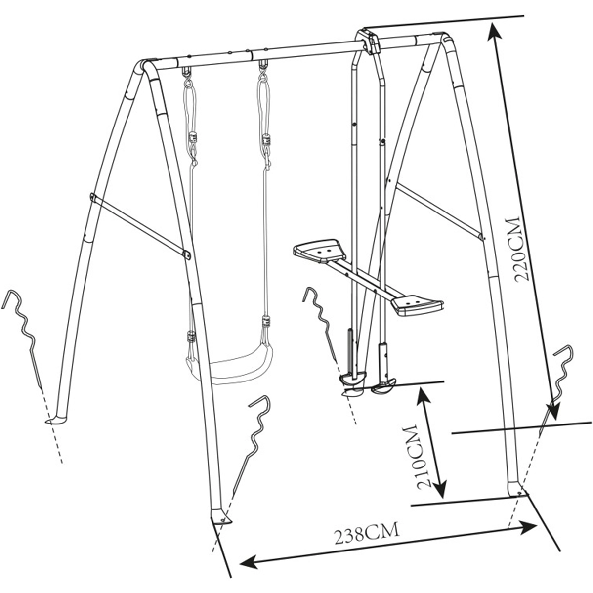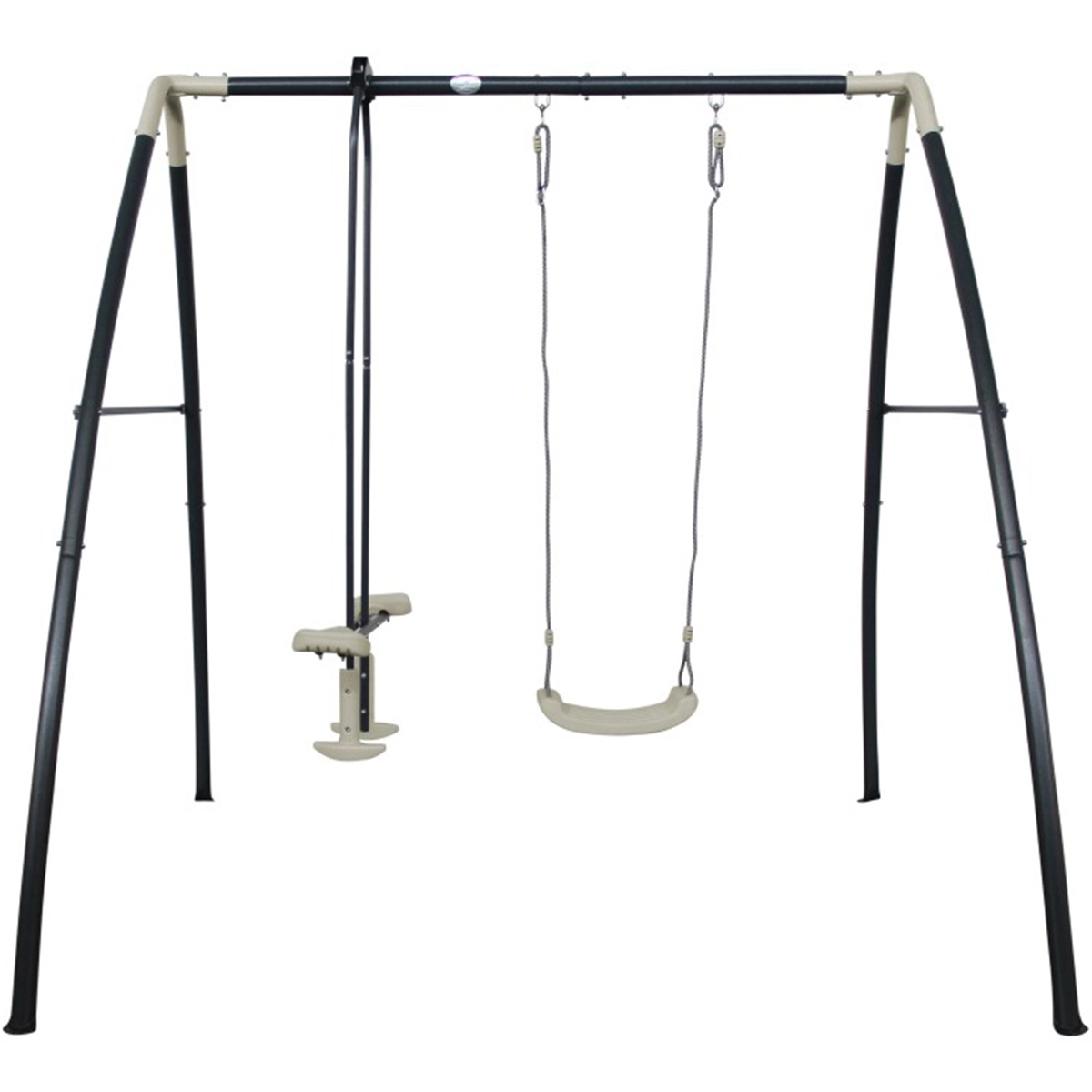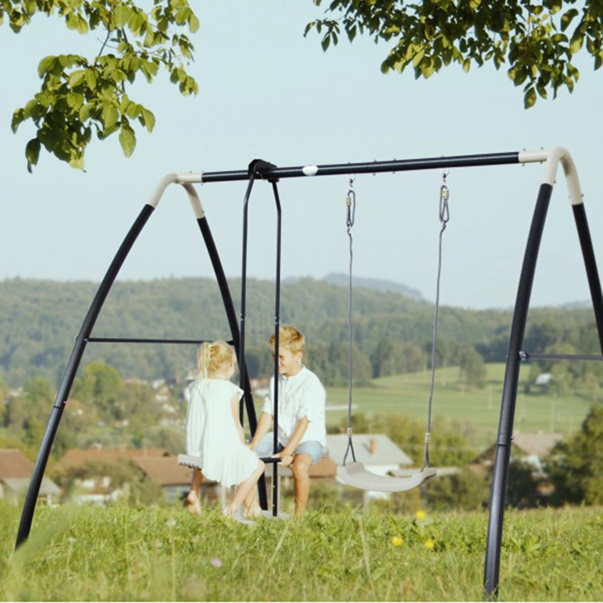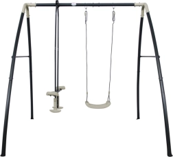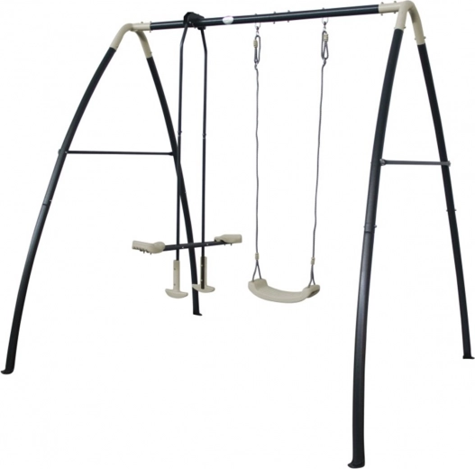 Die AXI Schaukel besteht aus pulverbeschichtetem Stahl, der sowohl innen als auch außen verzinkt ist, was für einen langfristigen Korrosionsschutz sorgt. Die kompakte Größe ermöglicht auch die Platzierung in kleineren Gärten.