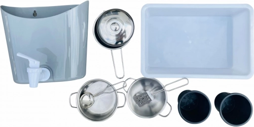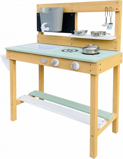 Das Holz, aus dem die Küche gefertigt ist, ist mit einer umweltfreundlichen Beschichtung behandelt, sicher für Kinder und erfüllt die CE- und EN-71-Normen. Es besteht aus 100 % FSC-zertifiziertem Hemlockholz, das witterungs- und fäulnisbeständig ist.