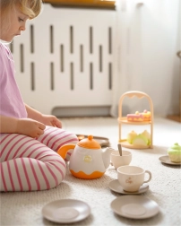 Mit diesem niedlichen WOOPIE Tee-Set tauchen Kinder spielend in die Welt der Erwachsenen ein – sie veranstalten eigene Teerunden, laden Familie und Freunde ein und lernen Teilen und Höflichkeit. Die reichhaltige Ausstattung mit Teekännchen, Tassen mit Untertassen, Löffeln und Desserts fördert kreative Rollenspiele und regt die Fantasie an.