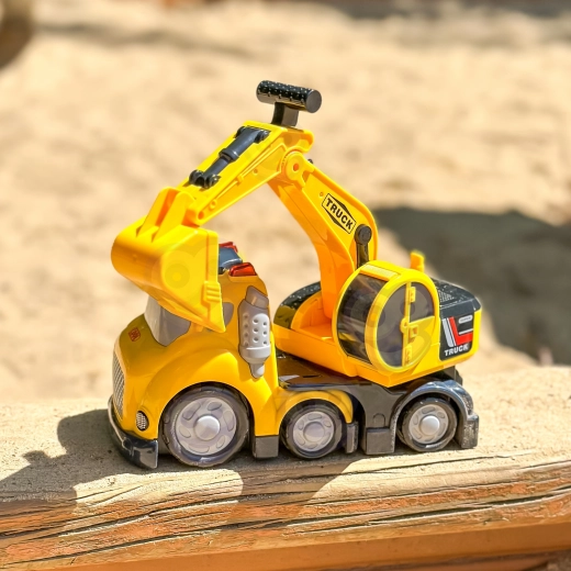 Der Arm mit Schaufel lässt sich heben und senken, sodass Sand oder kleine Spielzeuge leicht aufgenommen und ausgeschüttet werden können. Ideal für das Spiel auf der Baustelle.
