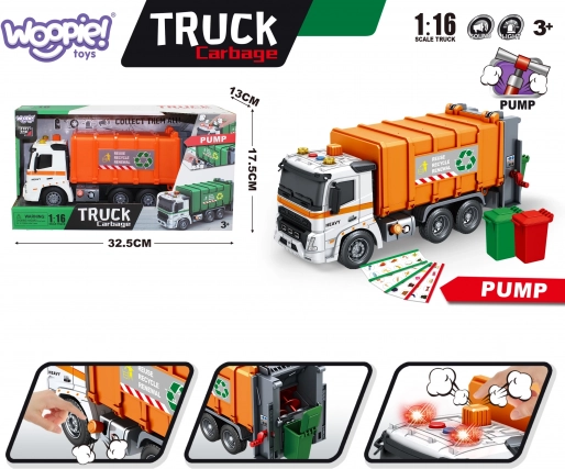 Der Müllwagen Woopie bietet realistische Effekte im Maßstab 1:16, die verschiedene Soundeffekte und funktionierende Lichter beinhalten. Er verfügt über ein pneumatisches System zum Heben und Senken des Containers und ist aus strapazierfähigem und kindersicherem Kunststoff gefertigt. Die hintere Klappe des Fahrzeugs ist zu öffnen.