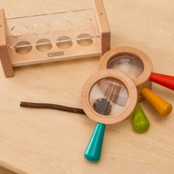 Das Set ist mit einem Holzständer mit transparentem Deckel ausgestattet, der die Lagerung erleichtert und die Lupen schützt. Kinder werden durch Spiel aktiv in ihrer Neugierde und ihrem Lernen unterstützt, was zur Entwicklung von Beobachtungsfähigkeiten beiträgt.