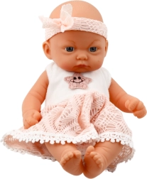 Babypuppe im rosa Kleid mit Spitzenabschluss und Haarband ist der perfekte Begleiter für die kleinsten Liebhaber des Rollenspiels zu Hause.