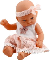Die Babypuppe im rosa Röckchen mit Spitze und passendem Haarband ist eine außergewöhnlich entzückende Option für die kleinsten Fans des Puppenspiels und das Nachahmen der täglichen Erwachsenentätigkeiten. Ihre geschlossenen Augen, der ruhige Gesichtsausdruck und die sorgfältig genähte, elegante Kleidung lassen die Puppe wie ein schlafendes Baby aussehen, das bereit ist, umarmt, gewiegt oder zum Schlafen gelegt zu werden. Die feinen Gesichtszüge verleihen ihr einen einzigartigen Charme und wecken natürliche Fürsorgegefühle beim Kind.