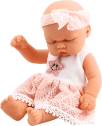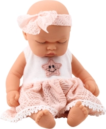 Die Puppe hat kompakte Maße – ca. 24 x 12 cm, was es erleichtert, sie in Kinderhänden zu halten und gleichzeitig in die meisten Puppenwagen und -betten zu passen. Stilvolle rosa Kleidung mit zarter Spitzenverzierungen und einer gestickten Sternchenmitte zusammen mit dem passenden Stirnband machen den kompletten Look aus, der den mädchenhaften und sanften Charakter des Spielzeugs betont.