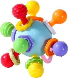 Das eingebaute Rasselspielzeug ertönt sanft bei Bewegung, was die Hörentwicklung fördert und die Aufmerksamkeit des Kindes auf sich zieht. Die kompakte Größe und die für kleine Hände geeigneten Griffe ermöglichen ein einfaches Greifen, Drehen und Drücken, wodurch die Koordination und die Greifkraft trainiert werden.