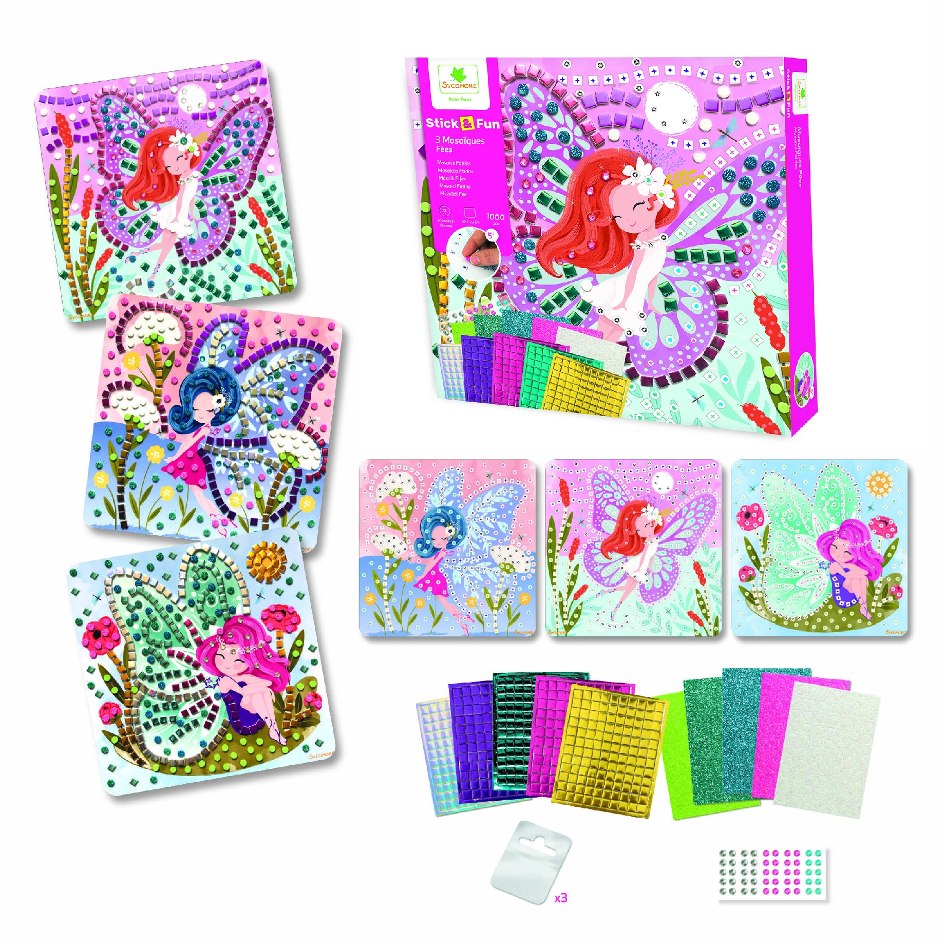 Kinder werden begeistert sein, wenn sie ihre eigenen wunderschönen Mosaikbilder mit Feen erstellen können. Mit Hilfe von selbstklebenden Steinen und glitzernden Mosaikteilen vervollständigen sie jedes Bild, das dann mit seinem eigenen einzigartigen Glanz erstrahlen kann. Nach Fertigstellung können die Kinder die Bilder stolz mit den mitgelieferten transparenten Hängern ausstellen.