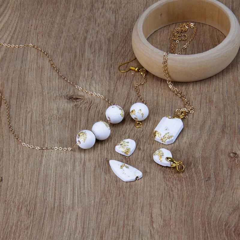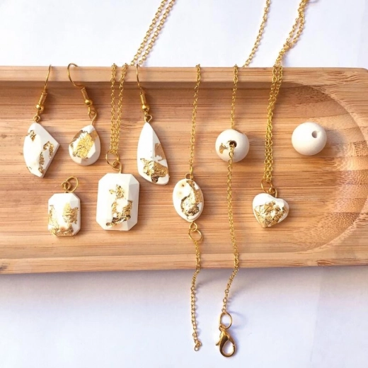 Wie funktioniert's? Mischen Sie den Zement mit Wasser gemäß der Anleitung, fügen Sie goldene oder kupferne Blättchen in die Form, gießen Sie die Masse ein und entfernen Sie die Abdrücke nach dem Trocknen. Verwenden Sie die beiliegenden Werkzeuge zur Fertigstellung und Montage Ihrer handgefertigten Schmuckstücke.