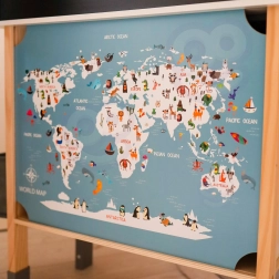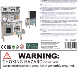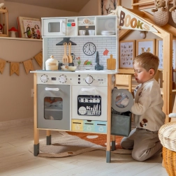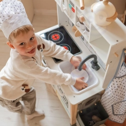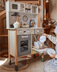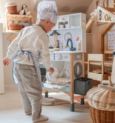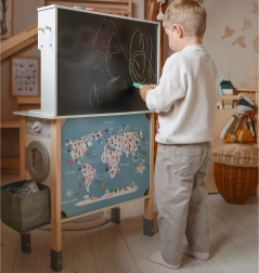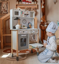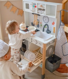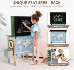 Diese WOOPIE GREEN Holzküche wurde für kleine Köchinnen, Köche und Entdecker entwickelt. Die Vorderseite bietet eine umfangreich ausgestattete Kochzone mit Kaffeemaschine, Mikrowelle, Spüle, Ofen, Geschirrspüler und einer Induktionskochplatte mit Licht und Geräuschen. An der Seite befindet sich eine praktische Waschmaschine mit Wäschekorb, die spielerisch Alltagsroutinen vermittelt. Die Rückseite verbirgt eine Kreidetafel und eine farbige Weltkarte zum Zeichnen, Kennenlernen der Kontinente und zur Entfaltung der Fantasie.