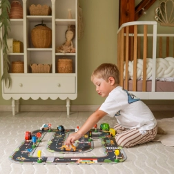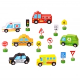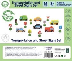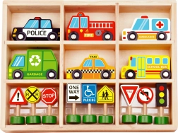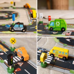 Das Set enthält 6 Fahrzeuge, eine Ampel und 8 Schilder, die Kindern helfen, sich die grundlegenden Regeln des Straßenverkehrs auf natürliche Weise anzueignen.