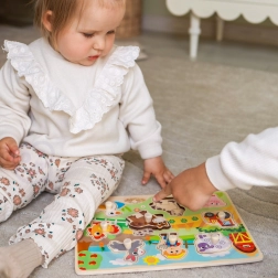 Kinder ordnen Tiere und Gegenstände den passenden Aussparungen zu, lernen Formen und Bezeichnungen und entwickeln die Hand-Auge-Koordination.