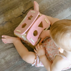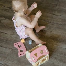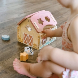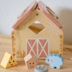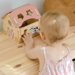 Die niedliche Holzscheune mit Aussparungen für Tiere und Formen motiviert Kinder zu aktivem Spiel und natürlichem Lernen. Durch das Einsetzen der passenden Teile üben Kinder Geduld, Konzentration und das Verständnis von Ursache und Wirkung. Das pastellige, natürliche Design fügt sich perfekt ins Kinderzimmer ein.