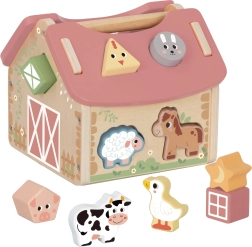 Das Dach lässt sich leicht öffnen, um die Teile bequem herauszunehmen und zu verstauen. Sorgfältig bearbeitete Holzelemente mit abgerundeten Kanten sorgen für sicheres Spielen. Enthalten sind verschiedene Tiere (Kuh, Schaf, Pferd, Gans) und bedruckte Formen, die Wortschatz und Fantasie fördern.