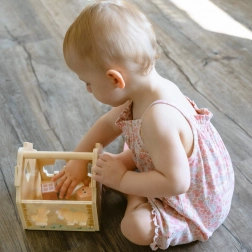Die robuste Holzverarbeitung und der bequeme Griff erleichtern das Tragen des Spielzeugs zu Hause und unterwegs.