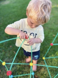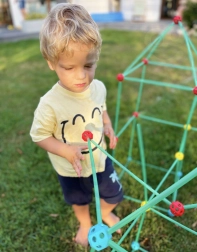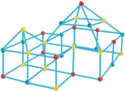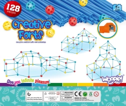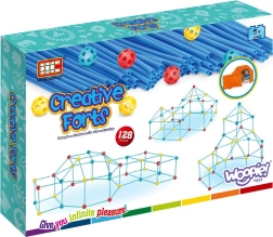 Das Set ist ideal zur Förderung der kreativen Fähigkeiten Ihres Kindes. Es enthält insgesamt 128 Elemente, die es ermöglichen, verschiedene räumliche Konstruktionen, einschließlich eines Zeltes, zu bauen.