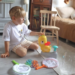 Das Geschicklichkeitsspiel der Marke WOOPIE ist für den Spaß der ganzen Familie gedacht. Es basiert auf Fertigkeiten, Konzentration und Bewegungskontrolle. Die Spieler müssen die mit einem Entenkatapult abgeschossenen Scheiben fangen. Je stärker Sie den Knopf drücken, desto höher fliegt die Scheibe, was das Spiel noch spannender macht.