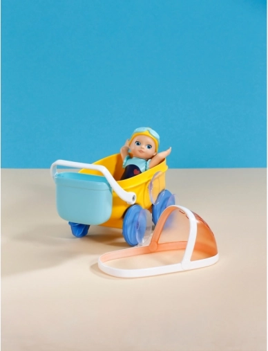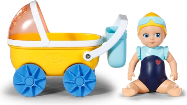 - Gelber Wagen, blaue Räder und Korb, Puppe in blauem Badeanzug