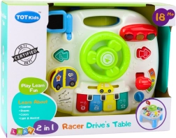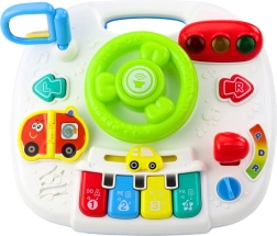 Das Panel enthält viele bewegliche und interaktive Elemente: Lenkrad mit Hupe, Lichtsignale, Klaviertasten Do-Re-Mi-Fa, Drehknopf zur Lautstärkeregelung, ein Buch mit Fahrzeugbildern, Spiegel, beweglichen Schalthebel, das Auto und weitere bunte Knöpfe. Durch Drücken der Tasten hört das Kind Autogeräusche, Lieder, fröhliche Melodien und aktiviert auch Lichteffekte.