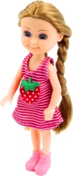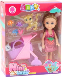 Die Mini-Puppe im Set hat lange blonde Haare, die zu Zöpfen geflochten sind, und ist in einem pink gestreiften Kleid und pinken Schuhen gekleidet. Das Set enthält einen pink-lila Kinderwagen, in dem zwei niedliche Kätzchen – eines weiß und eines braun – transportiert werden können. Das Set wird durch Tier-Accessoires ergänzt, wie Hut, Mütze und zwei Kronen, was es dem Kind ermöglicht, verschiedene Szenen zu erstellen und seine Vorstellungskraft zu entwickeln.