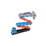 Dieses multifunktionale Set kombiniert einen Autotransporter und einen langen Rennkurs in einem. Nach dem Aufklappen wird aus dem Lkw eine doppelte Strecke mit 210 cm Länge, auf der Kinder spannende Duelle austragen und Rekorde messen können.