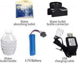 Im Set finden Sie Blaster, Magazin, Schutzbrille, wiederaufladbaren Akku und USB-Kabel. Einfach die Kügelchen hydrieren und losspielen.