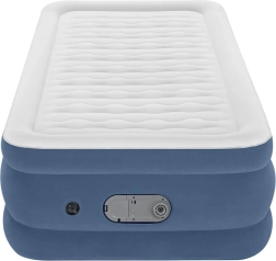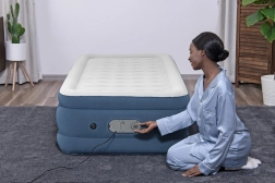 Die höhere Konstruktion (46 cm) erleichtert das Ein- und Aussteigen, während der Seitenrahmen beim Schlafen Schutz vor dem Herunterrutschen bietet. Der integrierte USB-Anschluss und die elektrische Pumpe (220-240V) bieten eine moderne Lösung für den täglichen Gebrauch. Hergestellt aus strapazierfähigem PVC-Material für eine längere Lebensdauer.