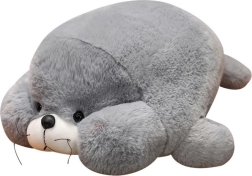 Der Plüsch-Seehund besteht aus hochwertigem Material in einem zarten Grauton, das einem realistischen Seehund mit einer freundlichen, leicht abgeflachten Form ähnelt. Sein abgerundeter Körper, die markanten Pfoten und das süße Gesicht mit Nase und Schnurrhaaren erwecken sofort Vertrauen und den Drang, ihn zu umarmen.