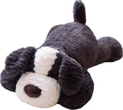 Dieser Plüschhund hat ein sympathisches Gesicht mit einer großen Nase, langen, hängenden Ohren und einem flauschigen Schwanz, was ihm ein außergewöhnlich freundliches und fröhliches Aussehen verleiht. Er liegt in einer bequemen, natürlichen Position mit Pfoten nach vorne und hinten, was die kindliche Fantasie und Kreativität fördert.