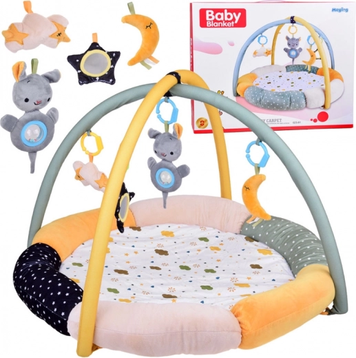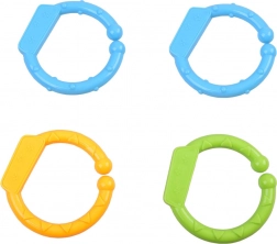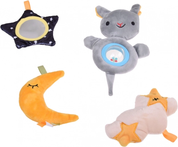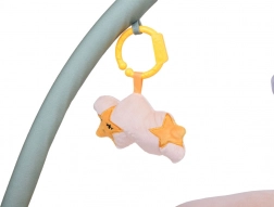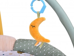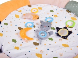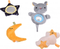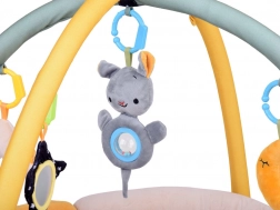 Das Set enthält zwei Bögen, die zur Aufhängung von vier niedlichen Spielzeugen verwendet werden können, die speziell zur Entwicklung visueller, taktiler und auditiver Fähigkeiten entworfen wurden. Die Spielzeuge bieten die Möglichkeit zur Beobachtung, zum Greifen und stimulieren die Sinne des Kindes positiv: