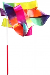 Hergestellt aus einem leichten, aber strapazierfähigen synthetischen Material mit einem dezenten Glanz, das gegen Verheddern resistent ist und hervorragend auf Bewegung reagiert. An dem Band ist eine Rute mit einem farbenfrohen Griff und einem flexiblen Federmechanismus angebracht, der ein Verdrehen verhindert und eine fließende Handhabung ermöglicht.