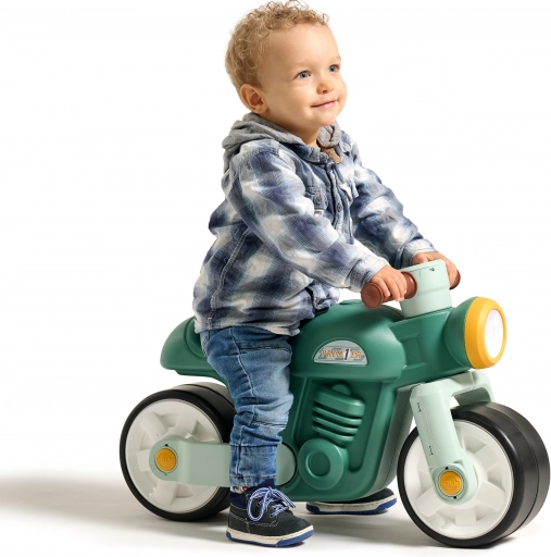 Das Falk Kinderlaufrad Motorrad Retro in grüner Farbe eignet sich hervorragend sowohl für den Innen- als auch für den Außeneinsatz. Es ist mit Blick auf die Sicherheit und den Komfort des kleinen Nutzers gefertigt.