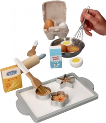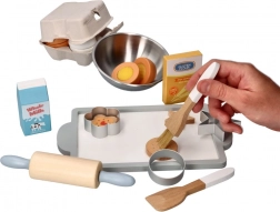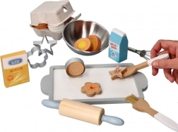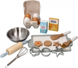 Nudelholz, Schneebesen, Pinsel, Ausstechformen und Schüssel ermöglichen es Kindern, echtes Backen nachzuahmen und den Umgang mit Werkzeugen zu üben.