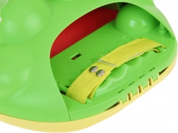 • An der Seite des Katapults befindet sich ein weißer Reißverschluss – schieben Sie ihn, um das Maul des Frosches zu öffnen und die Bälle einzulegen.