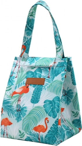 Die praktische und stylische Thermotasche fürs Mittagessen ist die ideale Lösung für alle, die ihr frisches Essen zur Arbeit, Schule oder zum Picknick mitnehmen möchten. Ihr originelles Design mit dem Motiv tropischer Blätter und Flamingos auf hellem Hintergrund zieht die Aufmerksamkeit auf sich und verleiht der gesamten Tasche einen sommerlichen, positiven Charakter. Durch ihre kompakte Form eignet sie sich hervorragend zur Aufbewahrung der wichtigsten Lebensmittel – von Sandwiches über Obst bis hin zu einer kleinen Thermoskanne oder einem Getränk.