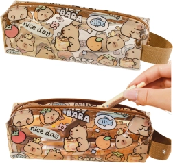 Dieses Schulmäppchen ist aus robustem, wasserdichtem PVC gefertigt, was es perfekt für den täglichen Gebrauch in der Schule und in der Freizeit macht. Das durchsichtige Material mit buntem Druck ermöglicht einen einfachen Blick ins Innere. Das Mäppchen ist mit einem braunen Seitenhenkel für leichtes Tragen ausgestattet.