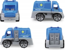 Robustes Polizeiauto aus hochwertigem Kunststoff für Kinder ab 2 Jahren. Bietet mechanische Funktionen ohne Batterien, öffnende Türen, aufklappbares Fahrerhaus und Polizistenfigur mit Schild für kreatives Spiel zu Hause und im Sand.